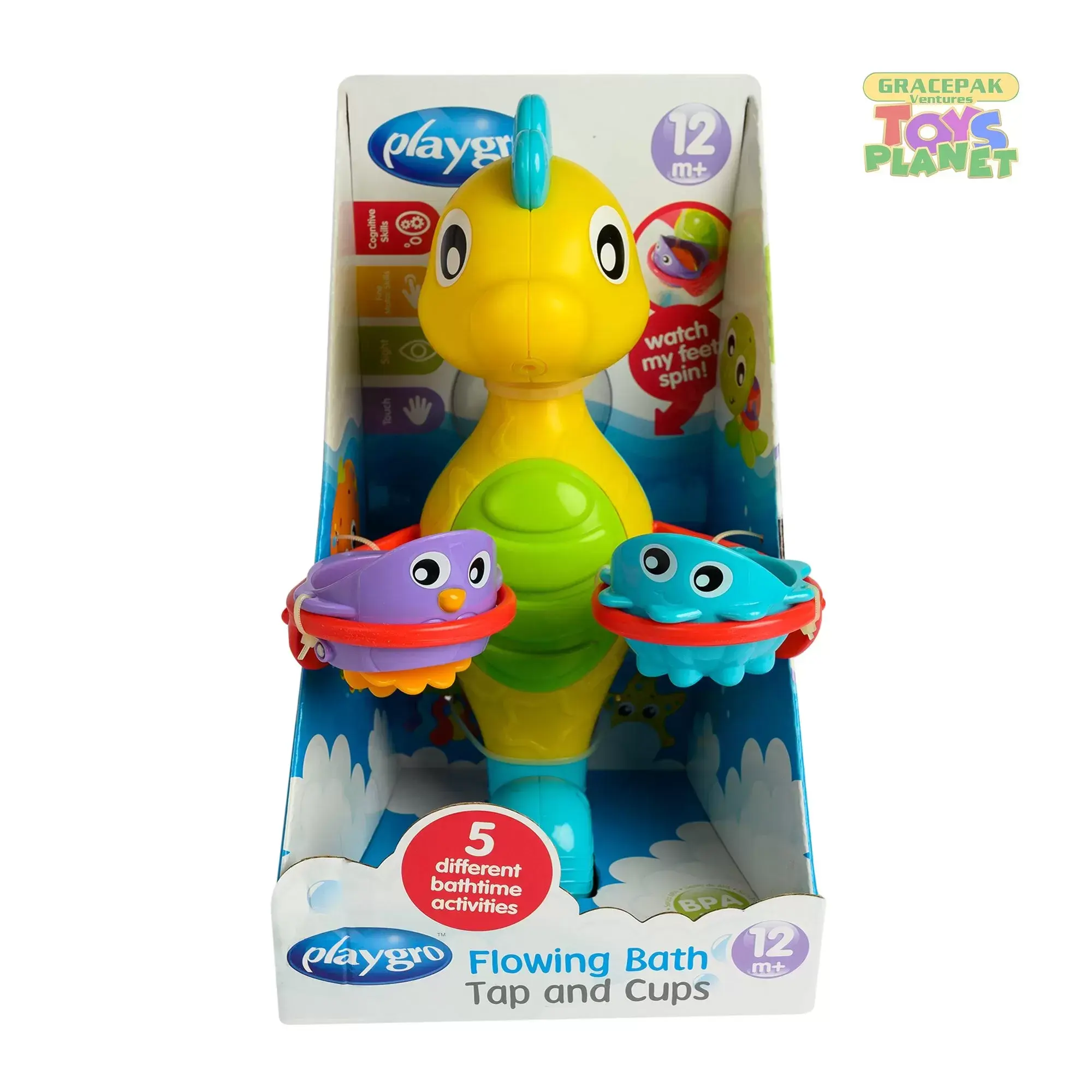 Go on an aquatic adventure with our developmental bath toy-Flowing Bath Tap and Cups. Simply press Seahorse?s belly to activate the water pump and see the water jet out of her mouth. Baby can move the Seahorse?s arms in and out to scoop, drain and spin the cups for endless splish splash fun. Easy to attach to and remove from tiles, baby will enjoy many bath time adventures under the sea.